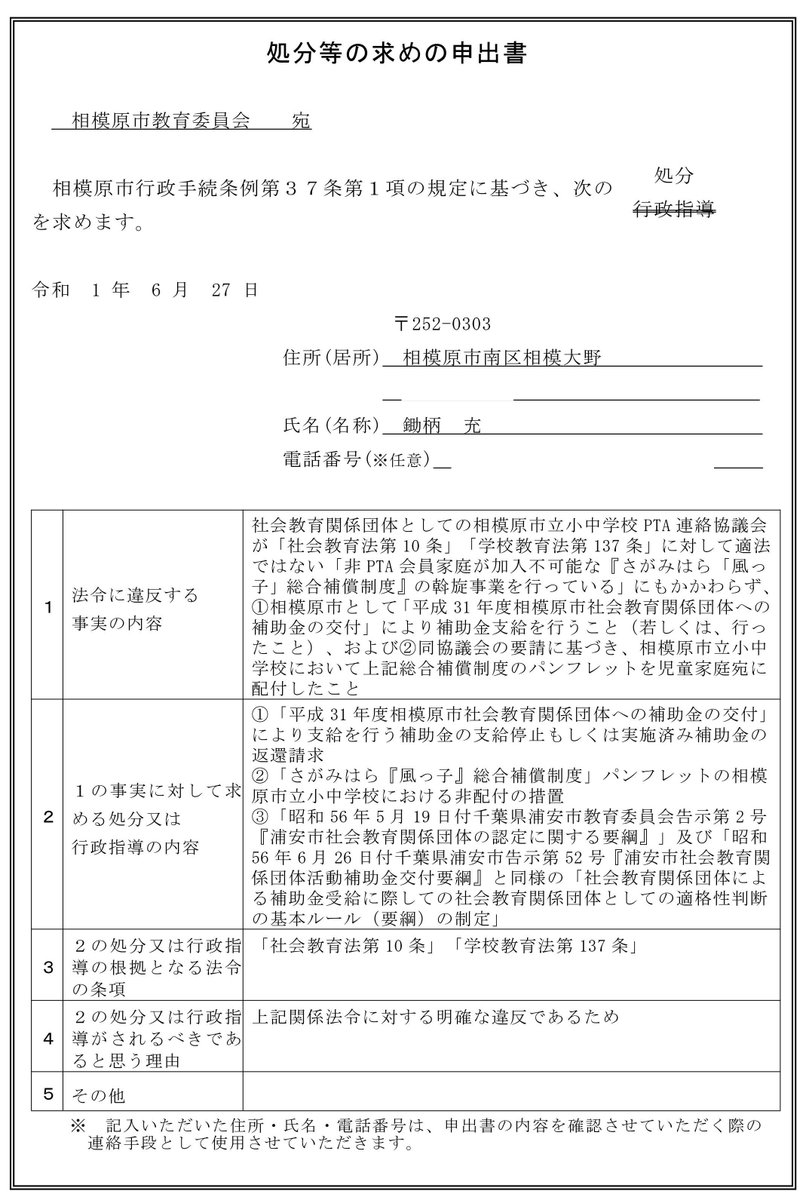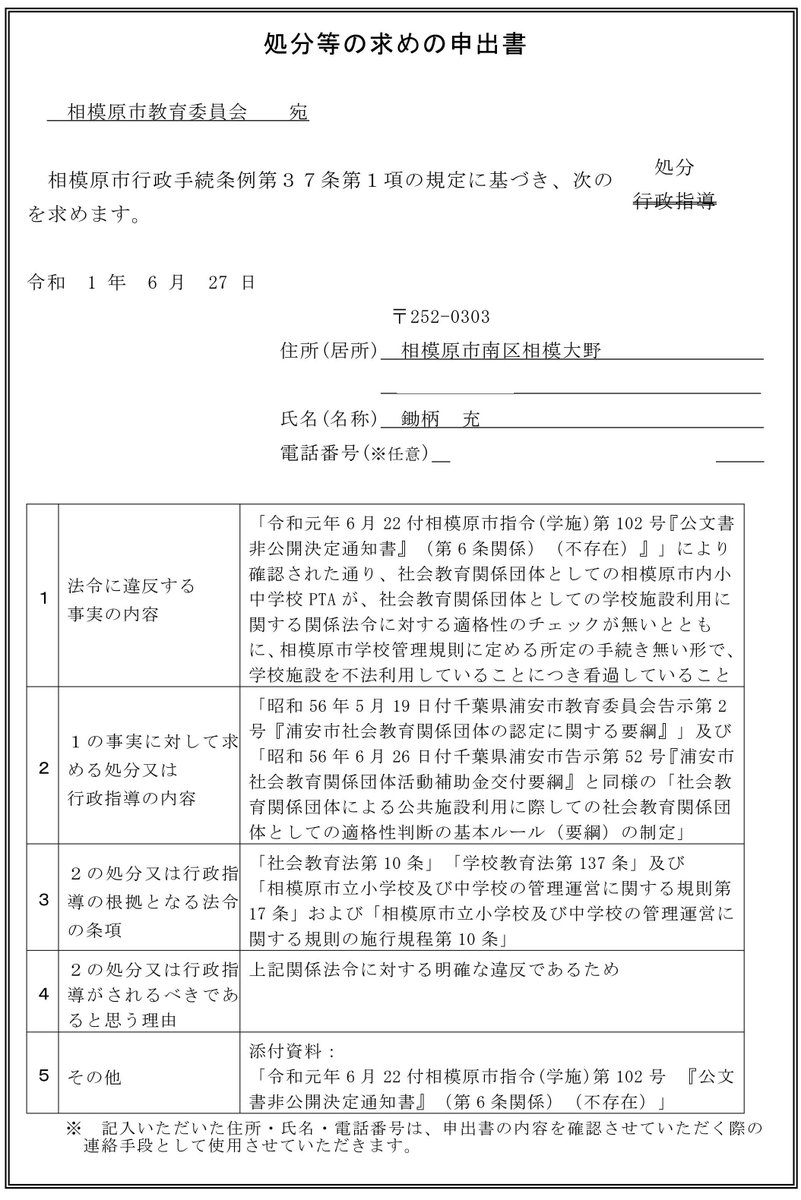相模原市のPTA関連部署に「相模原市行政手続条例に基づく『処分等の求め』の申出書」を提出(2019/6/28)